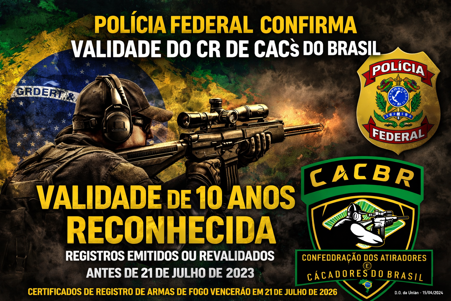 A Confederação dos Atiradores e Caçadores do Brasil – CACBR informa a todos os CACs do território nacional que possuem Certificado de Registro (CR) emitido ou revalidado antes de 21 de julho de 2023 que a Polícia Federal reconheceu oficialmente a validade de 10 (dez) anos desses registros.