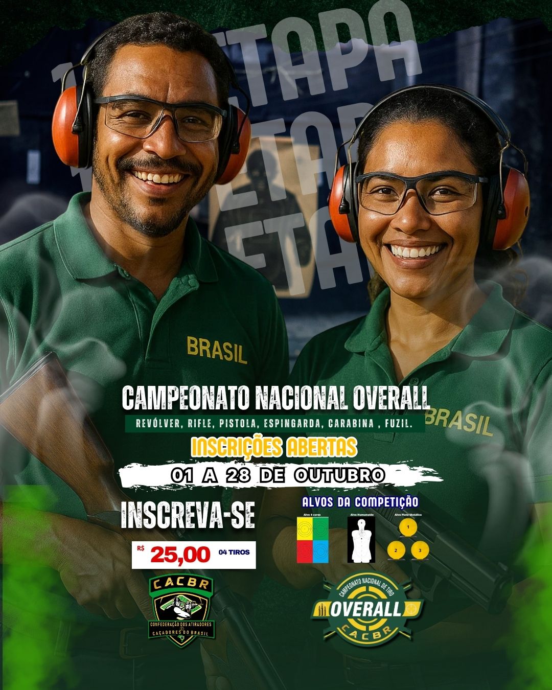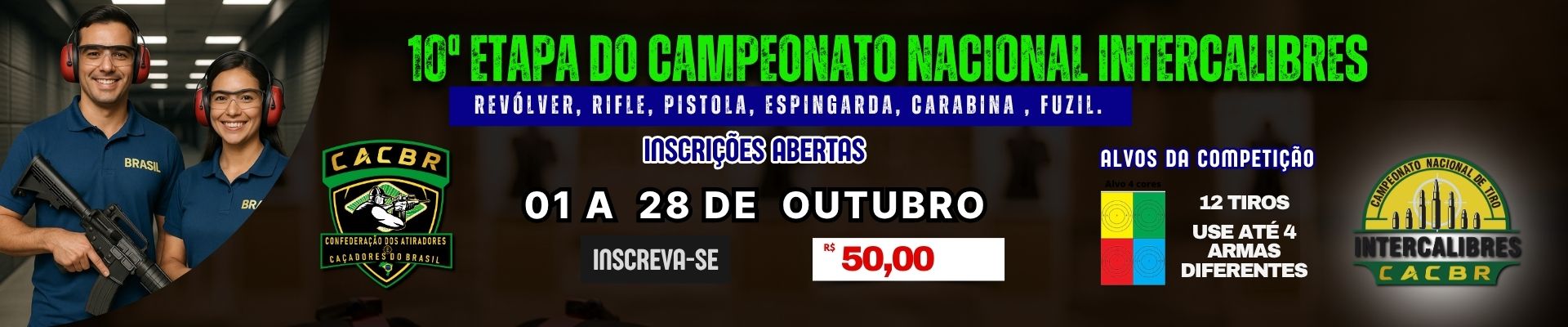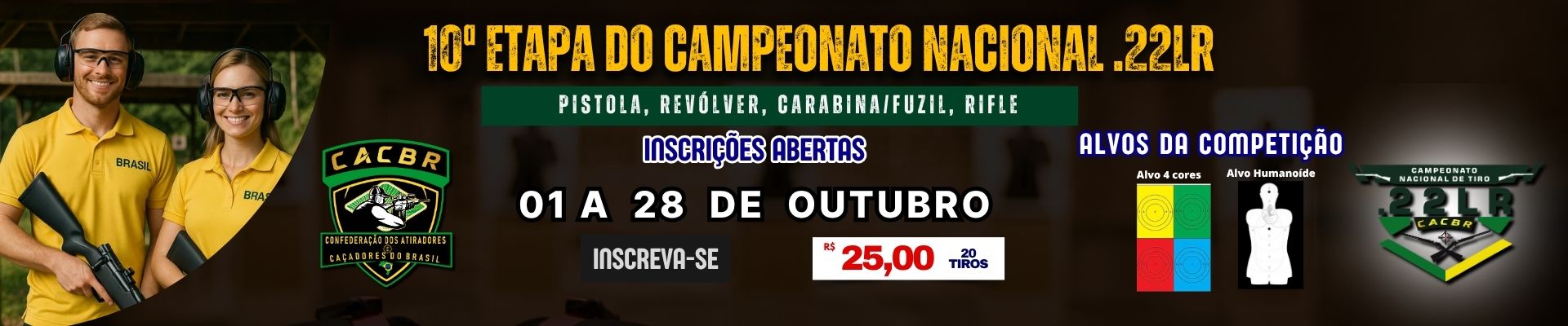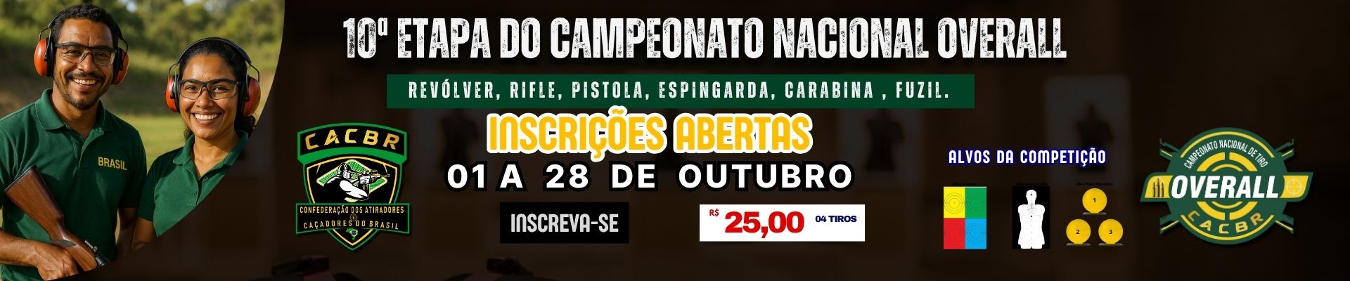 É com entusiasmo que informamos o início da 10ª Etapa dos Campeonatos Nacionais de Tiro da CACBR, válida de 01 a 28 de outubro. As disputas acontecem nas modalidades OVERALL, INTERCALIBRES e .22LR, com resultados oficiais e homologados no ranking nacional.