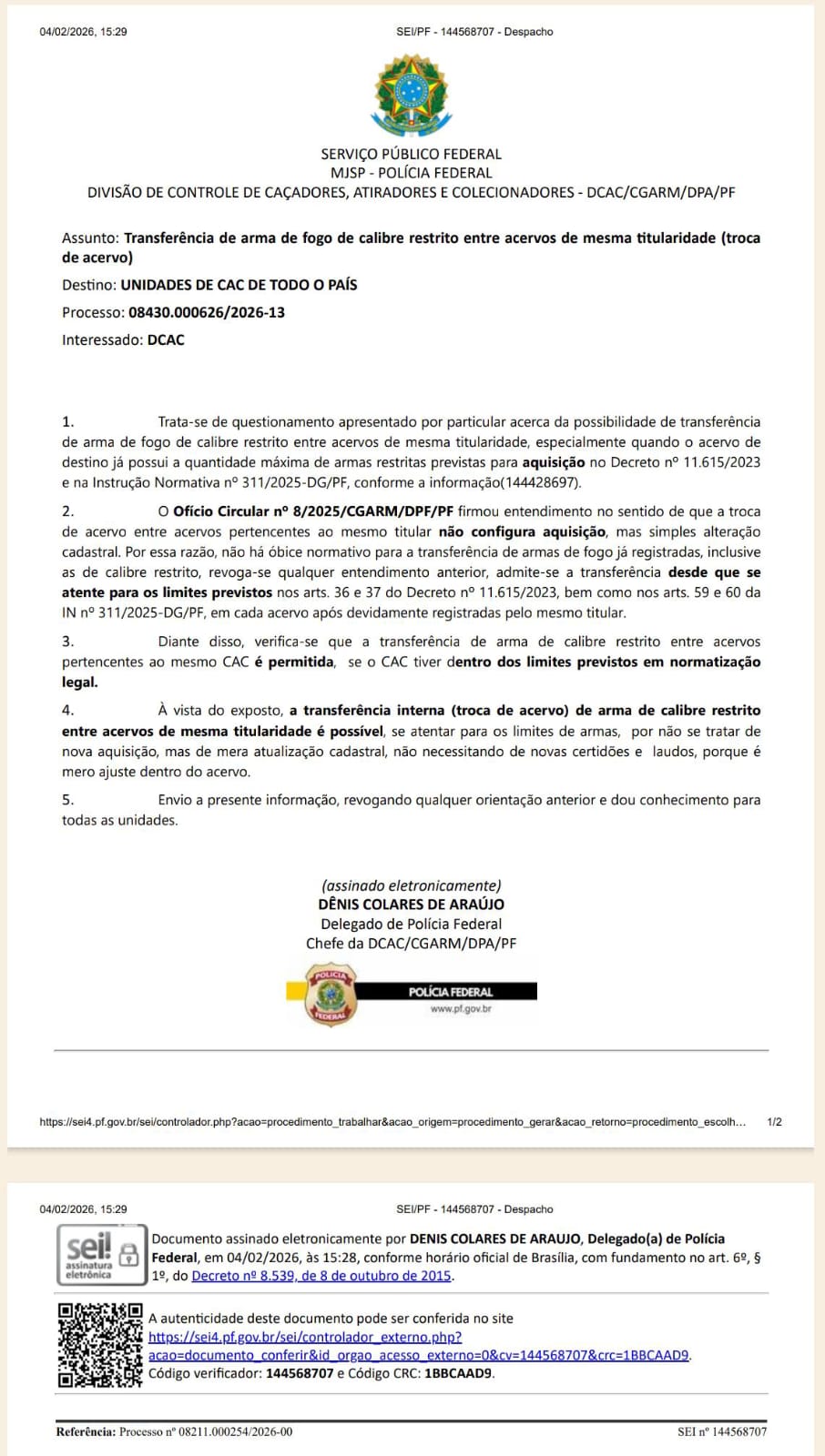 Conforme despacho encaminhado a todas as unidades de controle de CACs do país, a Polícia Federal estabeleceu que: